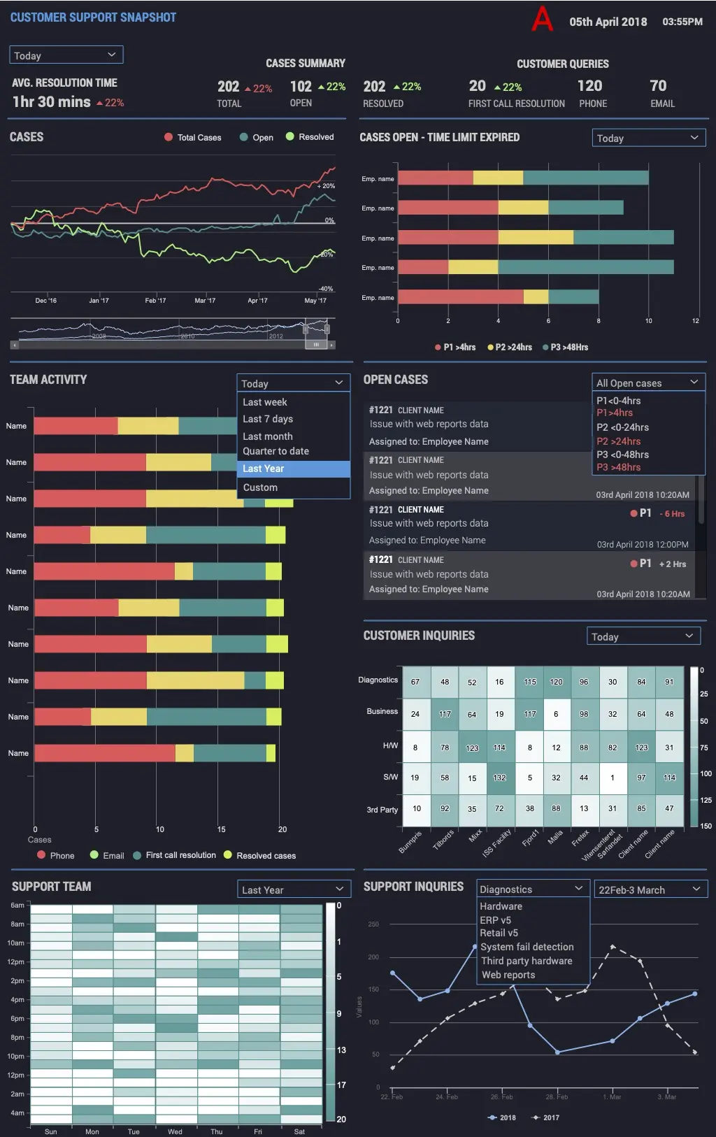- Team activity over Phone, Email, First call resolution & overall resolved cases