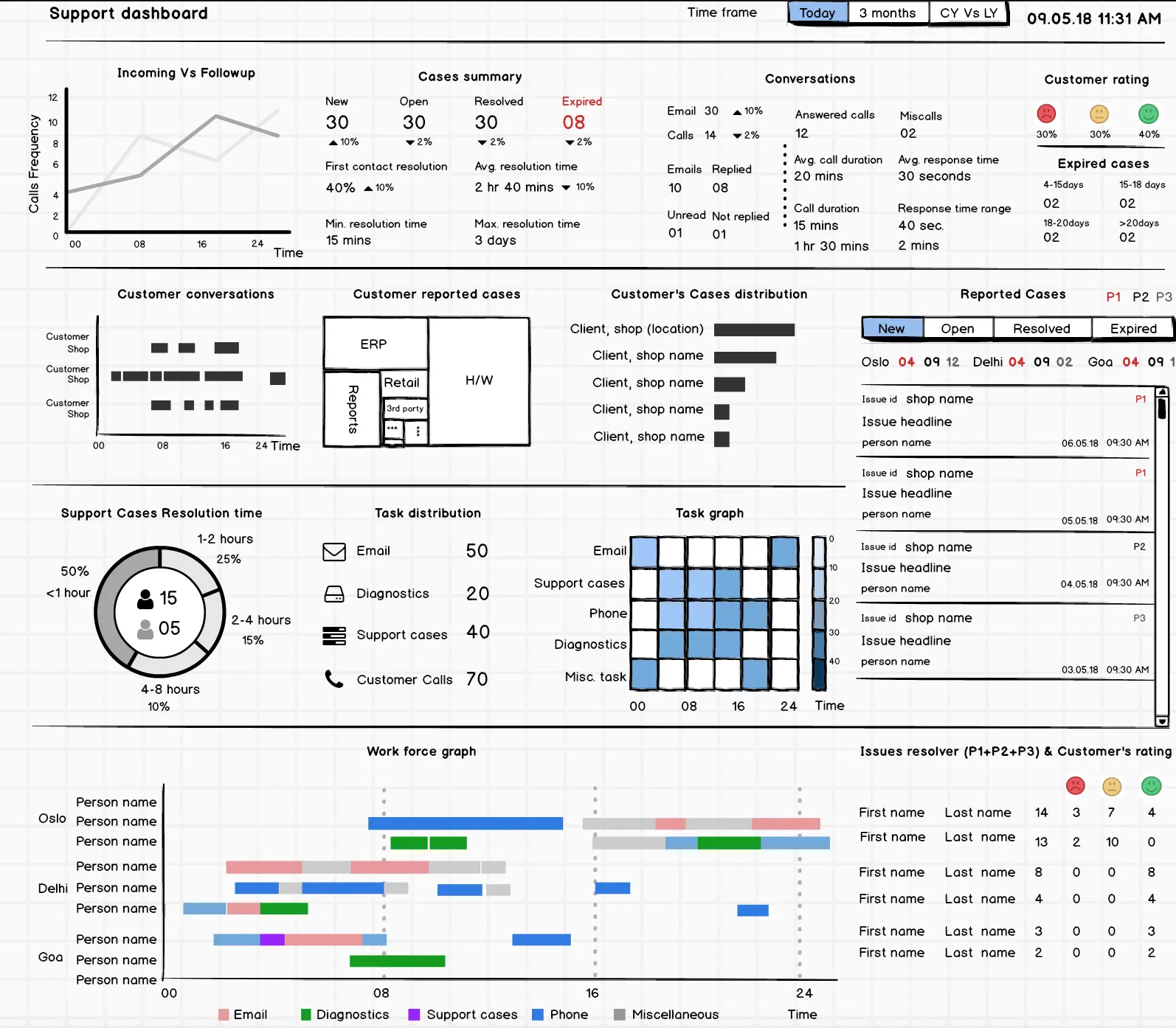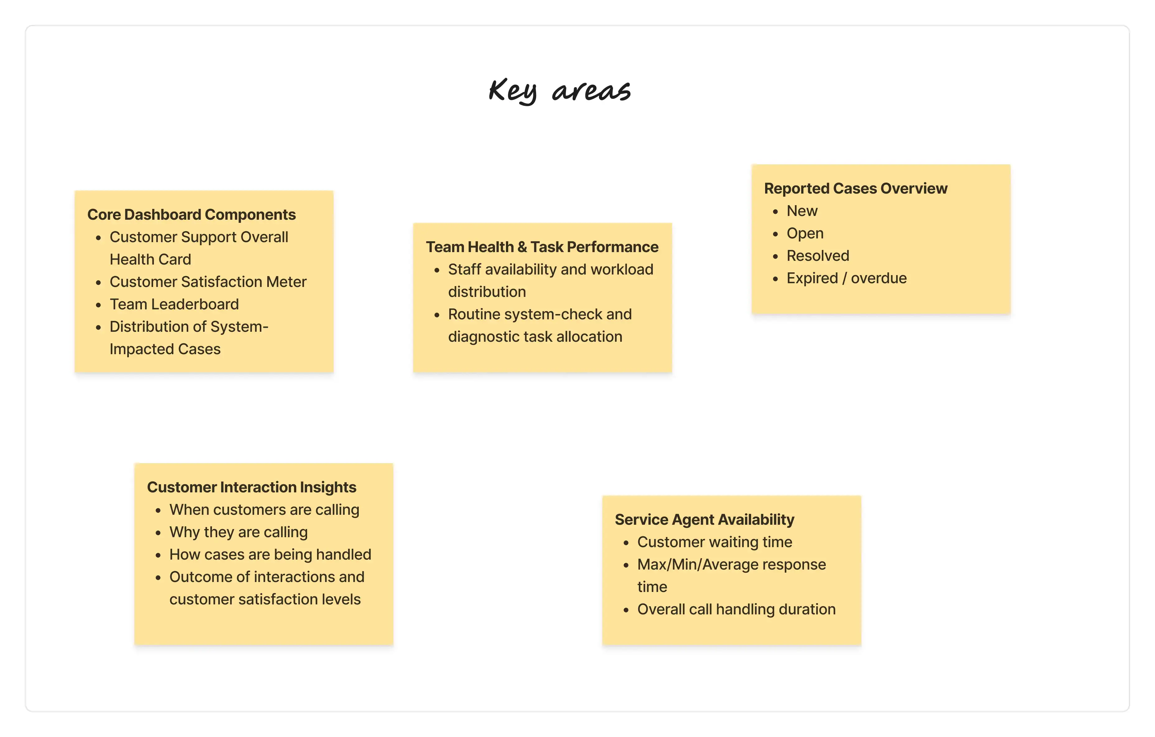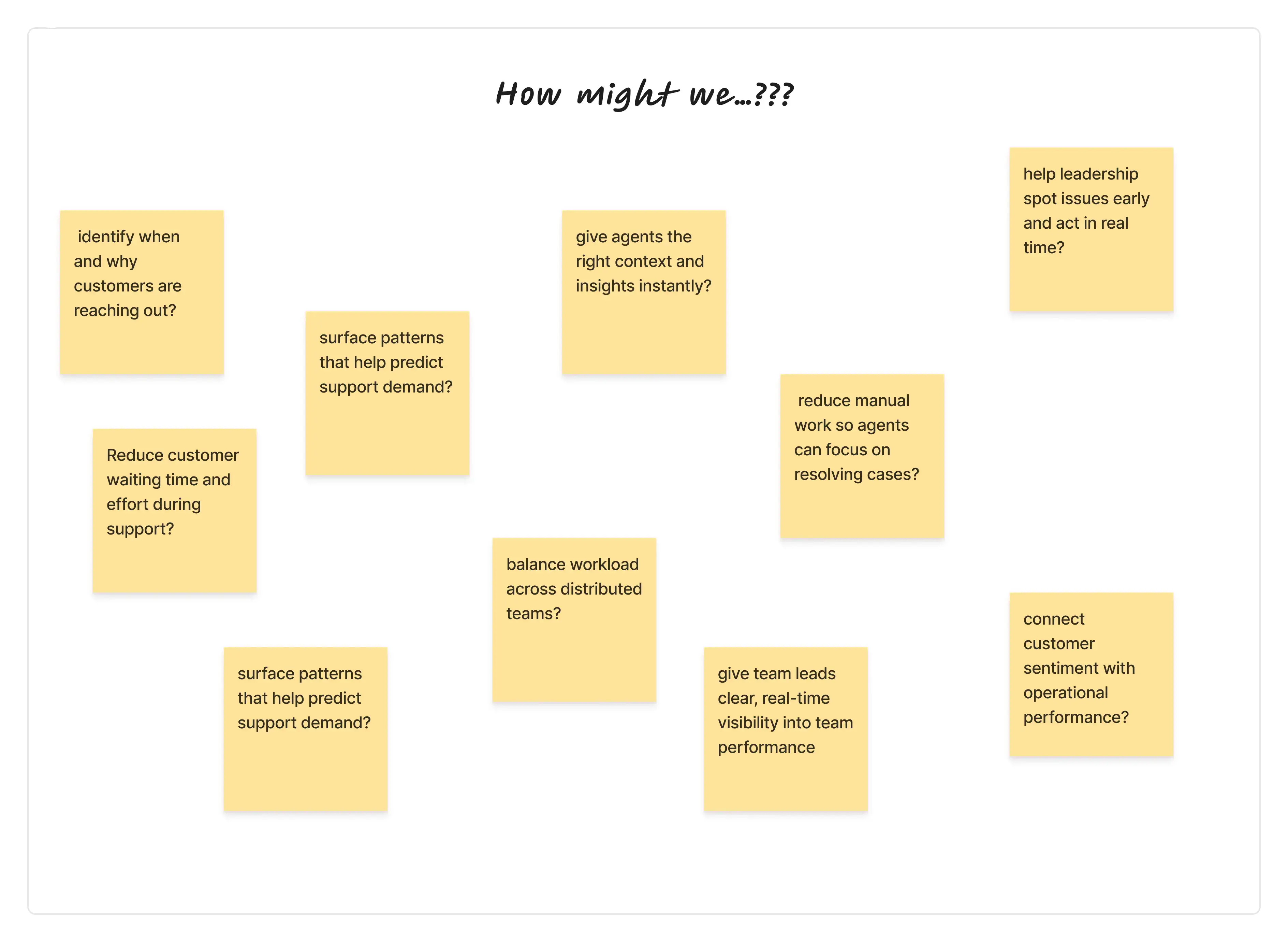 Based on Personas and the “How Might We” exploration, we identified key opportunity areas to guide the design of a unified Customer Support Dashboard for distributed support teams.