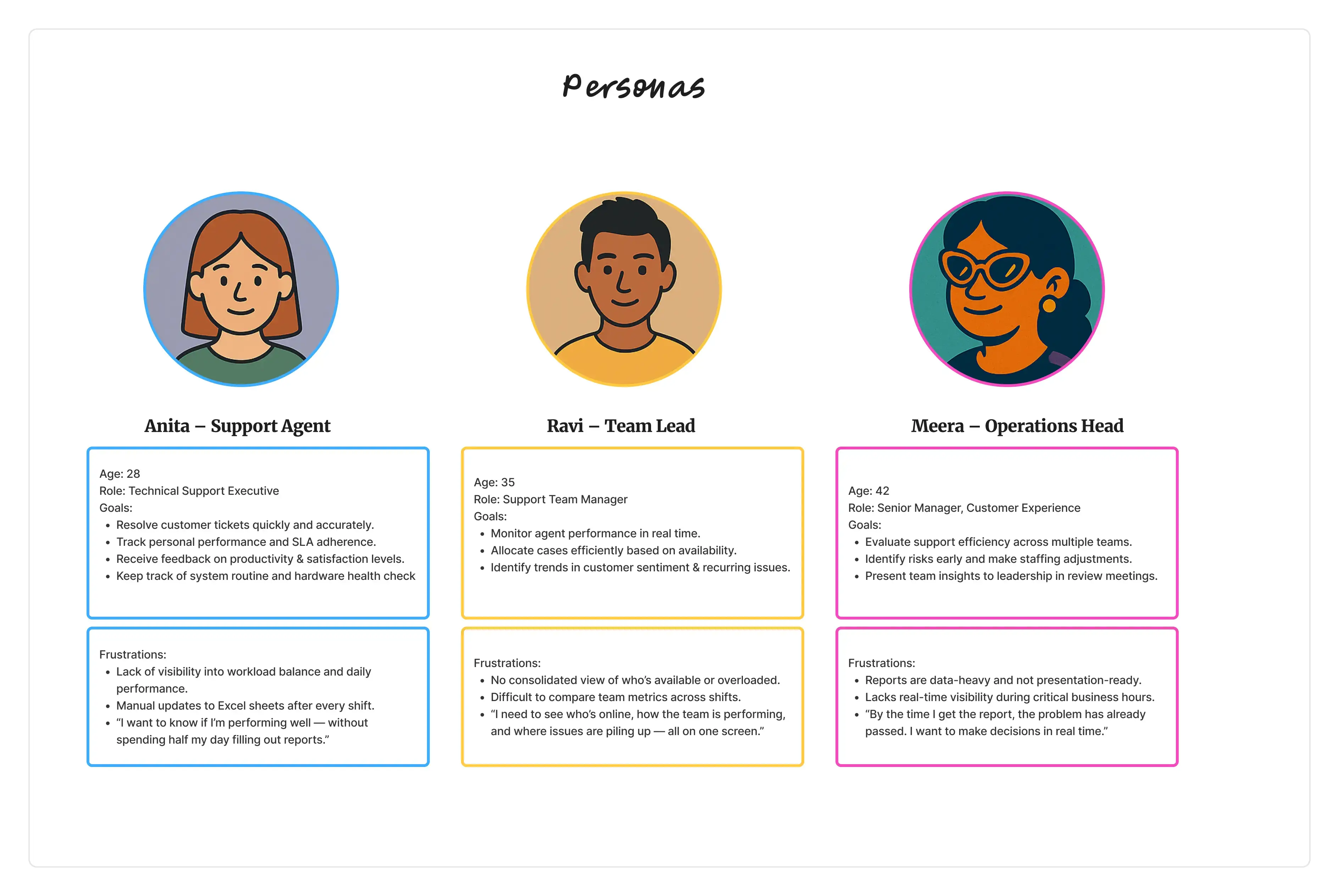 Spoke with support agents, team leads, and operations heads to uncover pain points, expectations, and workflow realities.